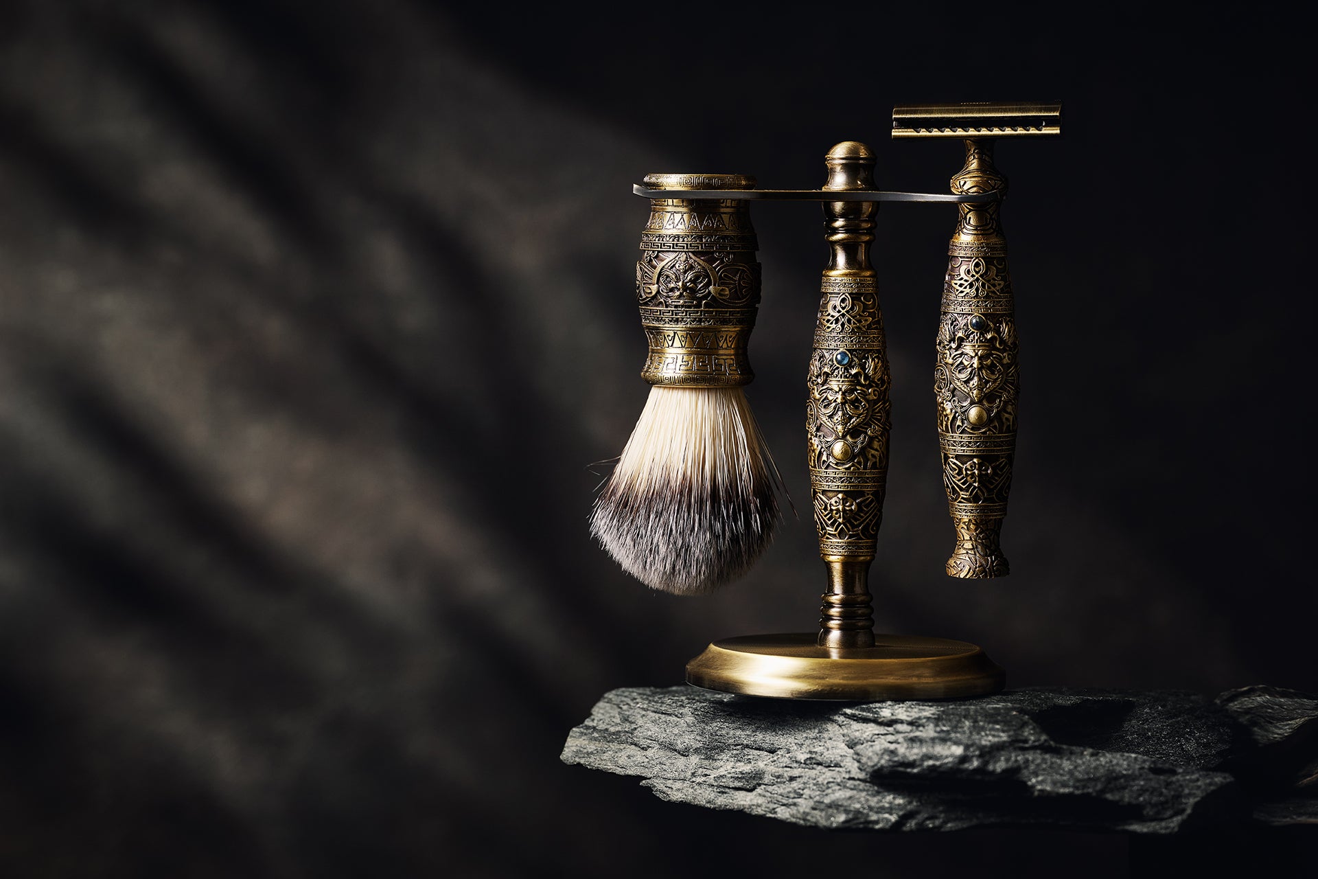 以佛教中八吉祥圖騰雕刻刮鬍刀將傳統與現代完美融合,將充滿祝福與祥瑞的「八吉祥圖騰」精雕細刻於刀身之上。每一個圖騰皆象徵著不同的吉祥寓意,包含法螺、寶傘、寶瓶、蓮花、雙魚、吉祥結、勝利幢與法輪,賦予刮鬍刀非凡的精神價值。