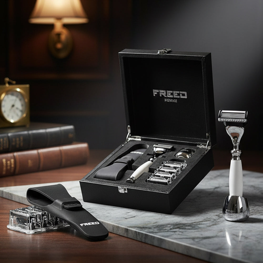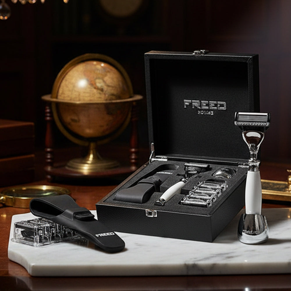 刀片採用歐洲鋼材製作而成,堅韌且鋒利的刀片使得刮鬍非常的輕鬆俐落,搭配安全裝置完美服貼肌膚角度讓刮鬍過程大幅降低受傷與鬍子拉扯的機率,全金屬材質刀身,完美的重量配比,手感操控性極佳,讓男人專屬的儀式感為您開啟每一天。