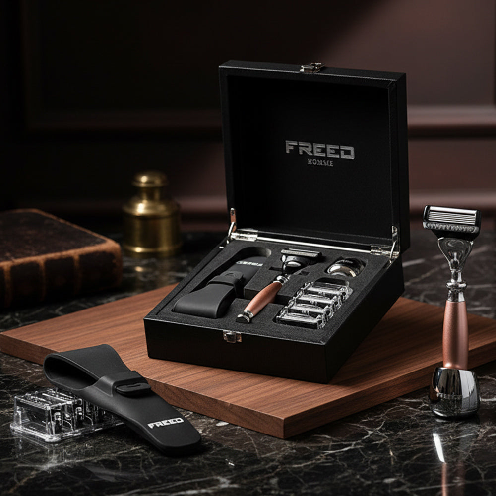 刀片採用歐洲鋼材製作而成,堅韌且鋒利的刀片使得刮鬍非常的輕鬆俐落,搭配安全裝置完美服貼肌膚角度讓刮鬍過程大幅降低受傷與鬍子拉扯的機率,全金屬材質刀身,完美的重量配比,手感操控性極佳,讓男人專屬的儀式感為您開啟每一天。