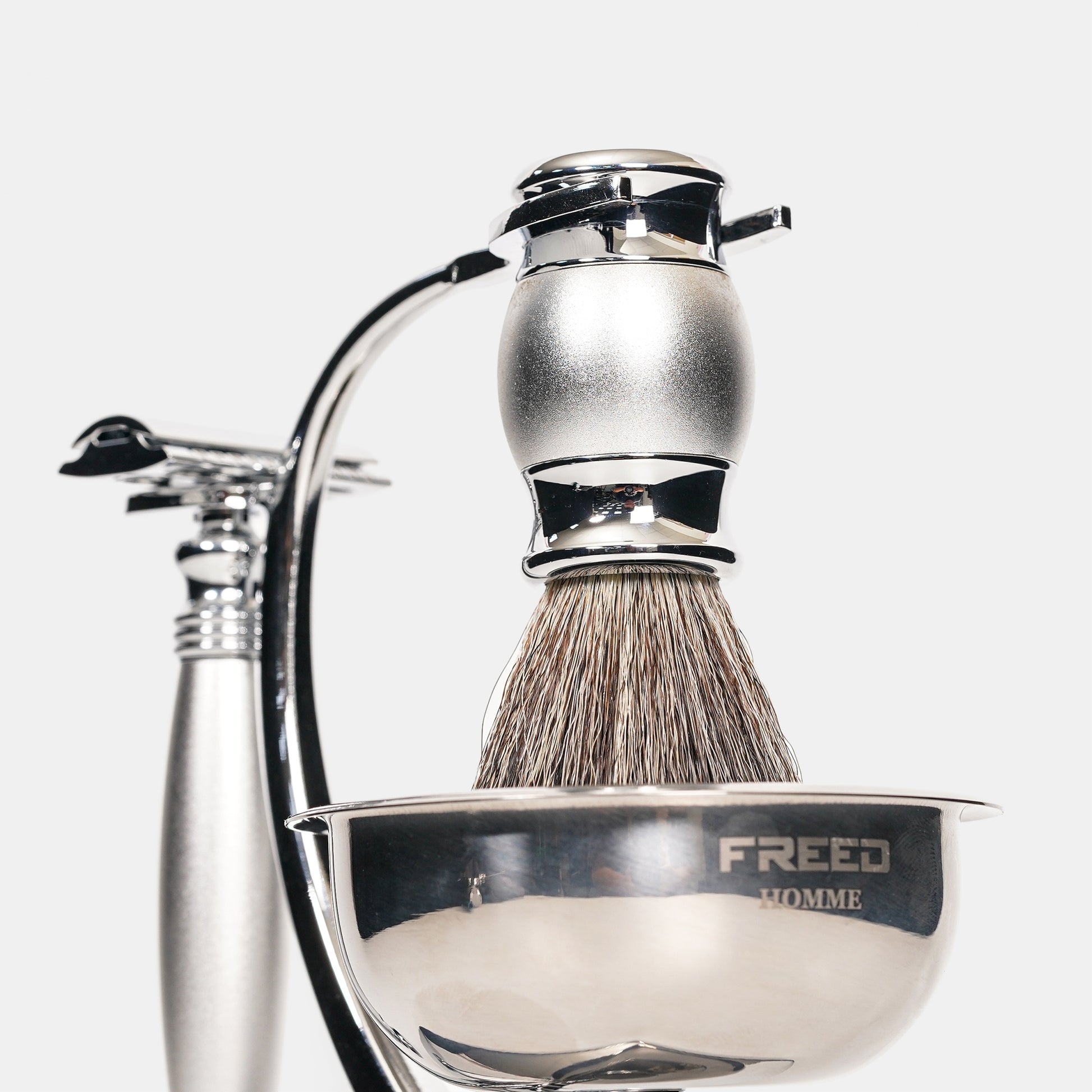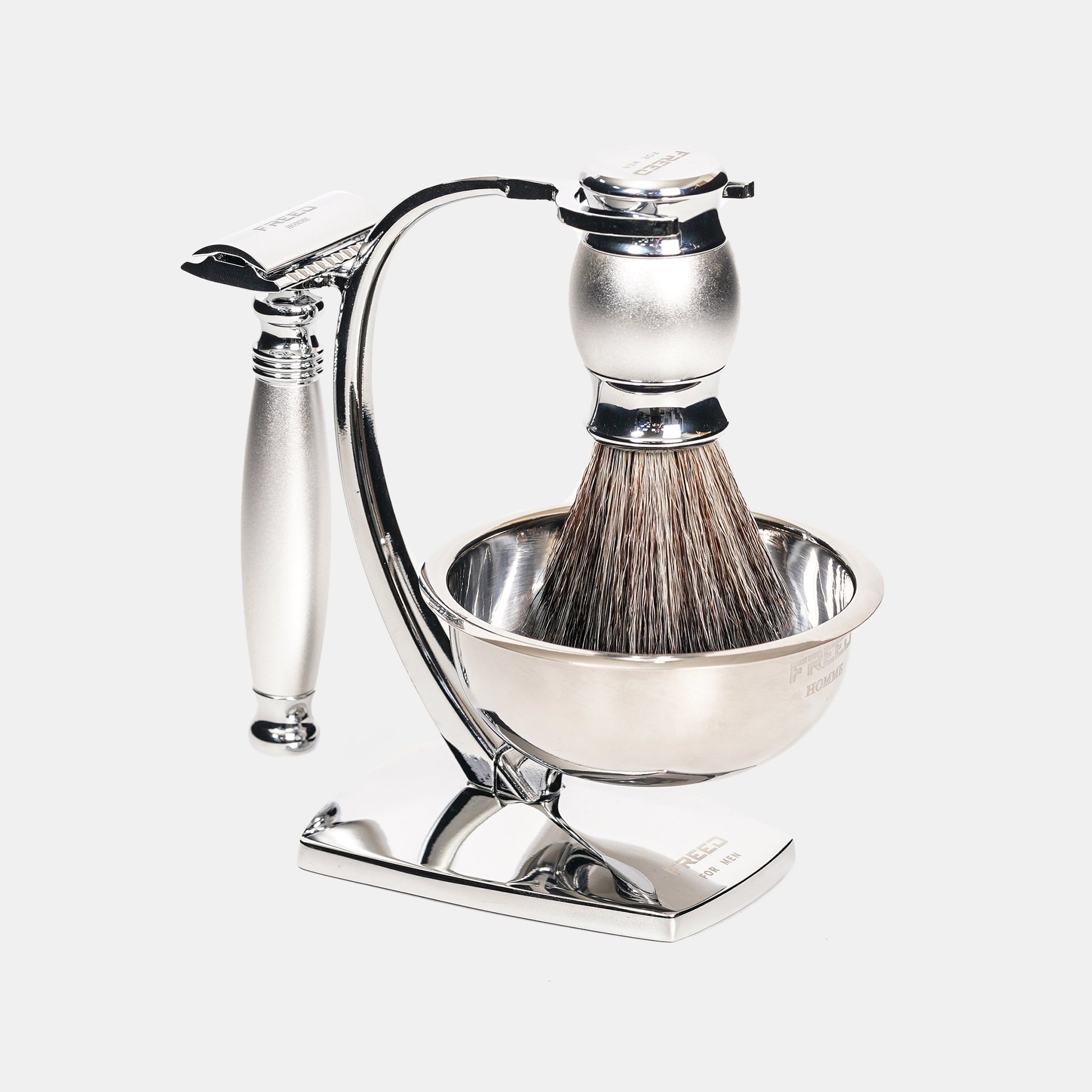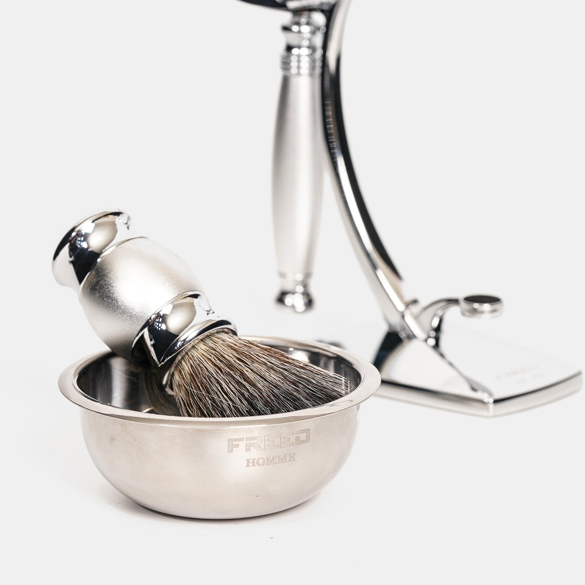 將男人所有修容工具匯集成為一件藝術擺設品而生,合金材質搭配完美設計比例,無論動與不動都非常型,底部設計搭配磁鐵,能夠吸住鬍鬚碗避免掉落 ,將英式輕奢的態度融入每一天生活裡,重新詮釋刮鬍與品味的細節,將設計與工藝的美感再一次提升