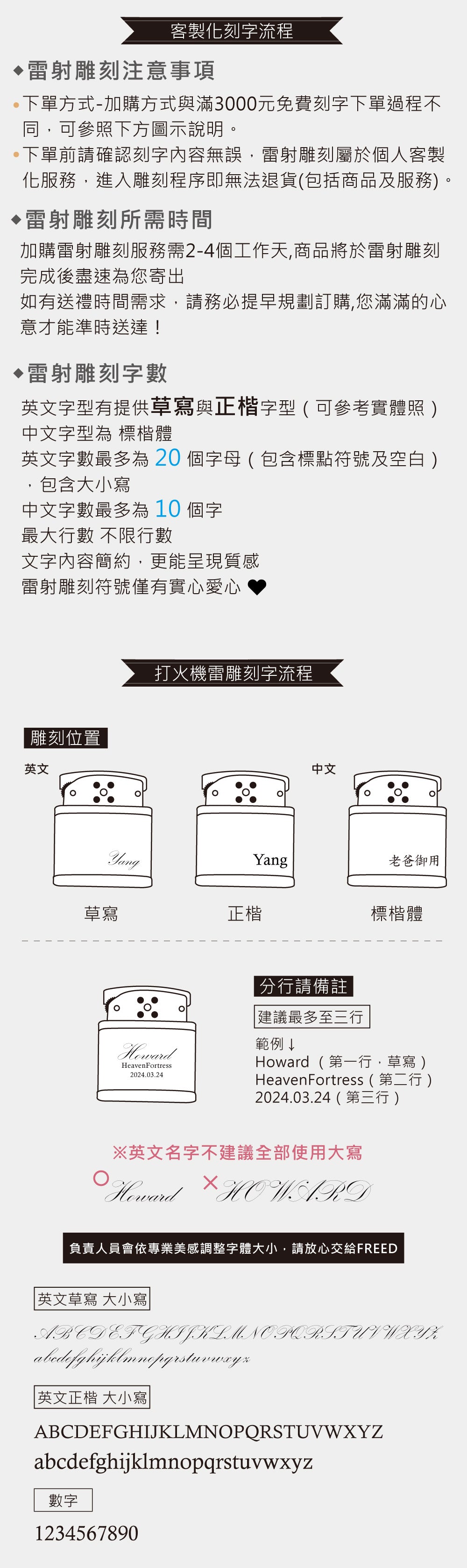一行20字元,最多三行,英文可以選草寫(建議10個字母)或者整體,中文10個字,也可以刻數字,若是皮帶或者打火機等其他產品,因為空間問題會有不同的限制,若有進一步需求都歡迎點選線上客服及時為您服務。